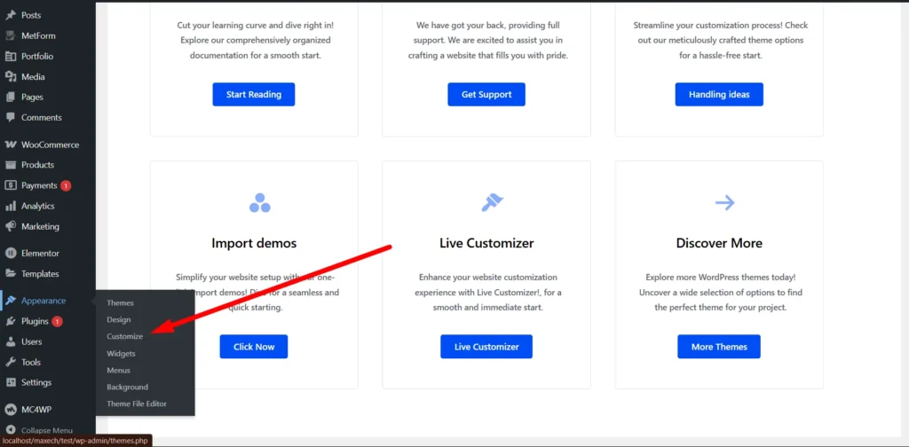 Step 1: Open your site’s customizer, located under Appearance –> Customize.