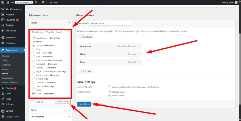 1- Select the pages you want to add, then click “Add to Menu”