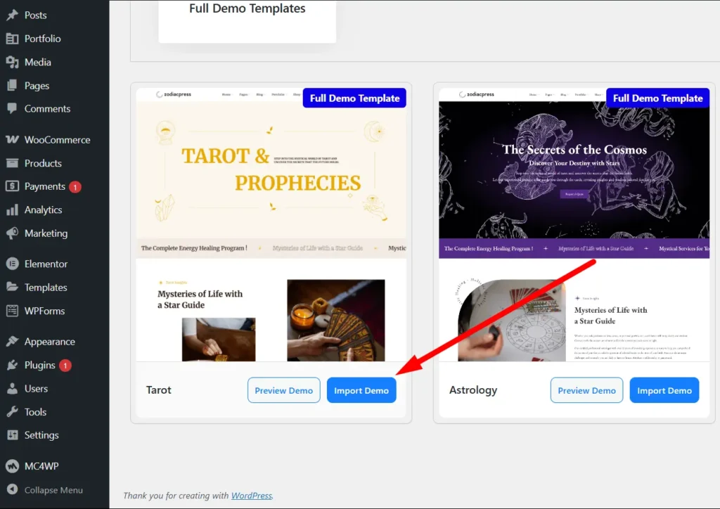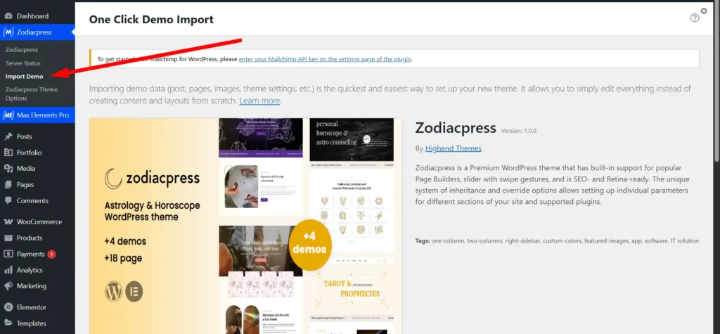Step 1: Log in to your WordPress dashboard and navigate to {theme_name} –> Import Demo.